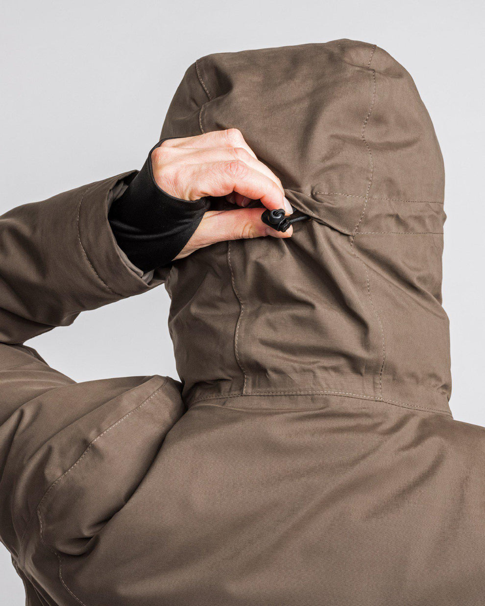 Den höga frontkragen håller hals och ansikte varmt och det tillslutande tyget vid ärmsluten hindrar kall luft och väta från att ta sig in. Mjuk fleeceklädd krage innanför huvan.
