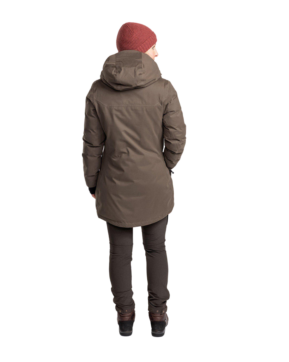 Vind och vattentät damjacka i längre modell, med miljövänlig isolering av 100% återvunna PET-flaskor.
