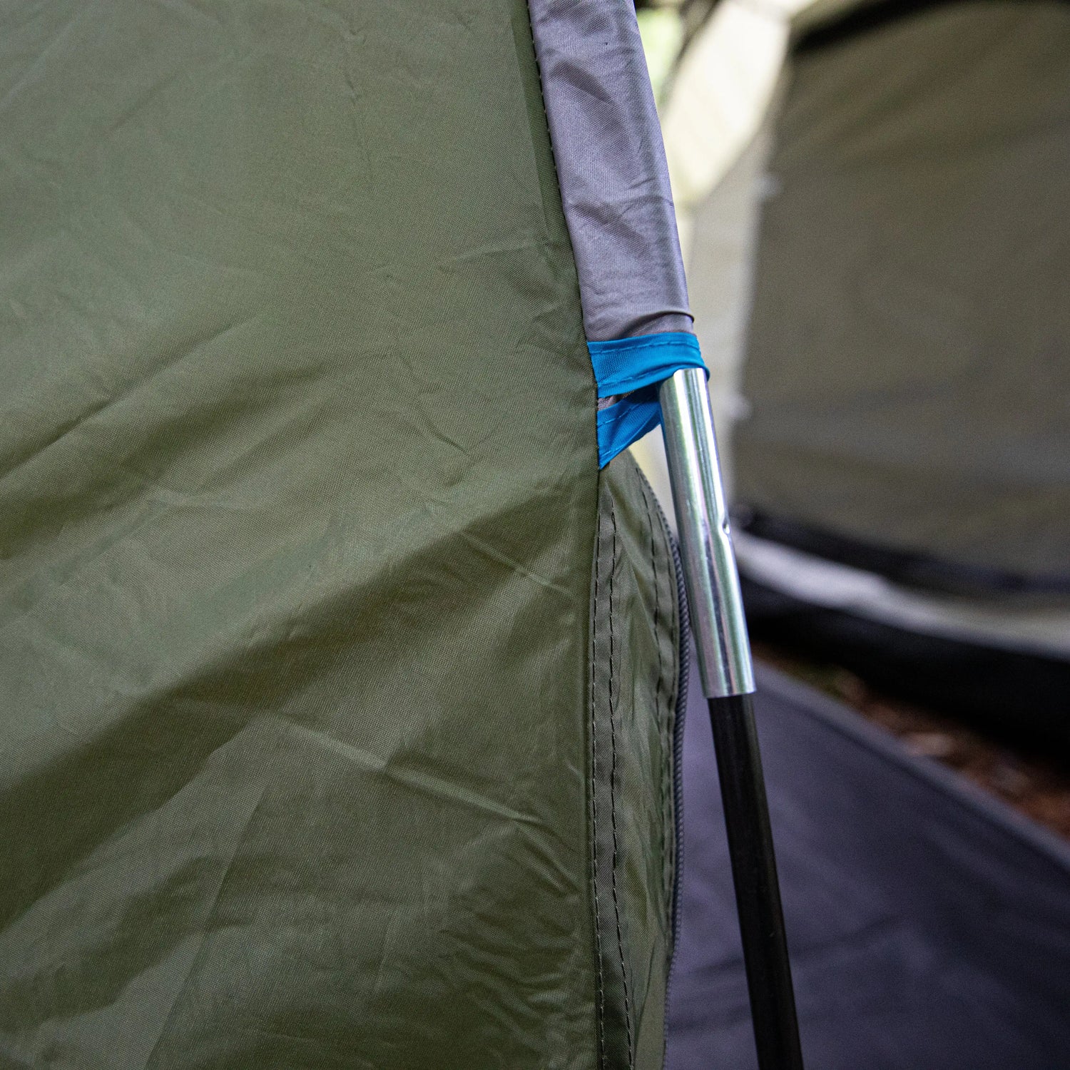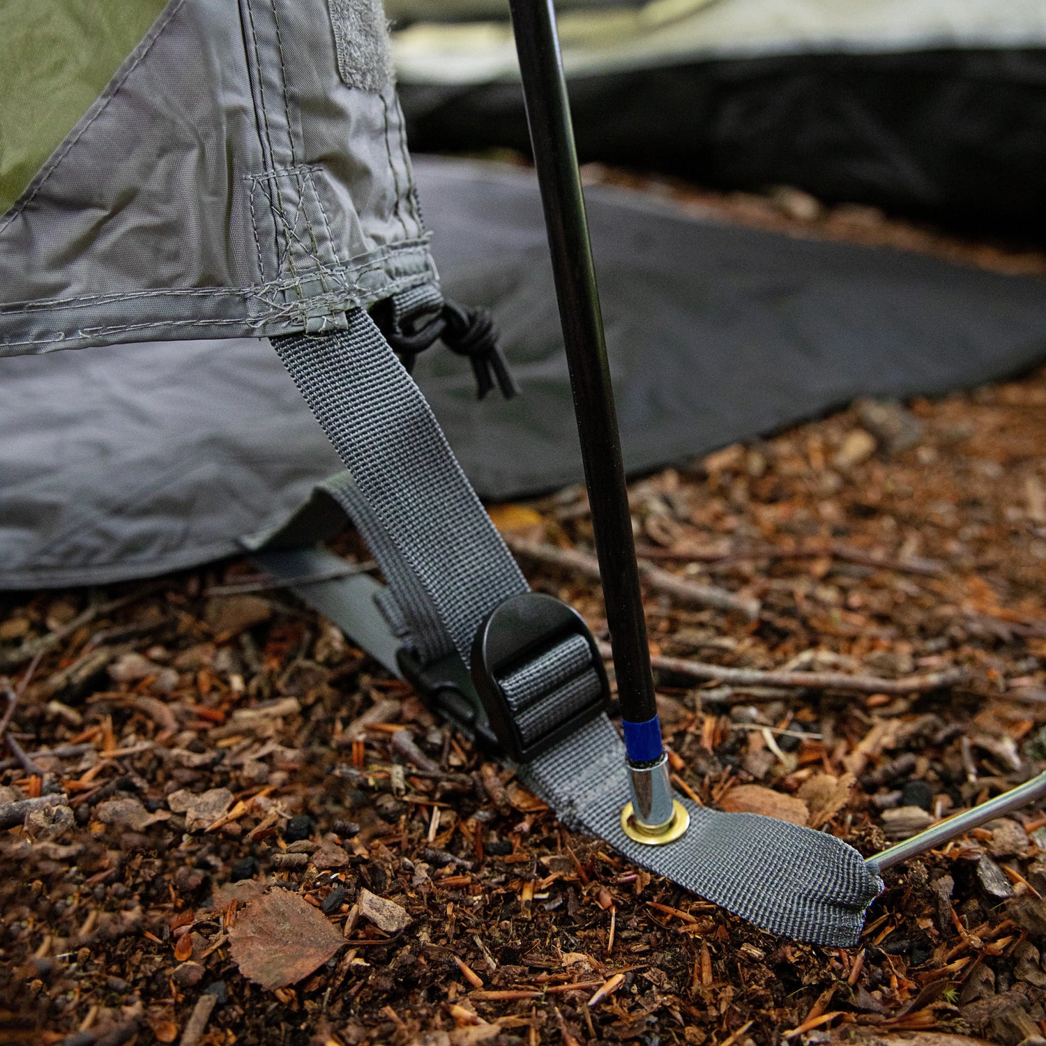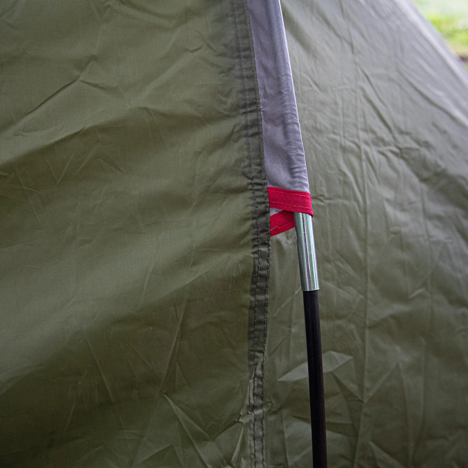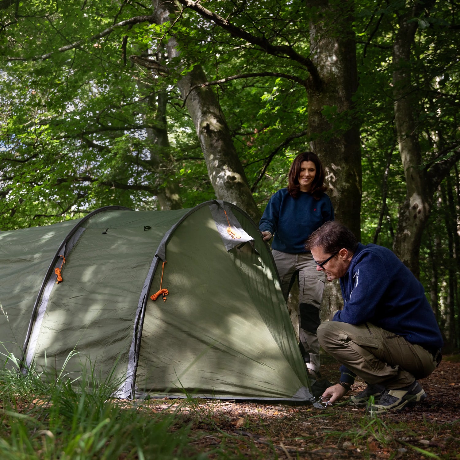 Tältet hålls upp av tre glasfiberbågar som enkelt träs in i de färgmärkta kanalerna. Innertältet krokas fast i yttertältet, låter du det sitta kvar i krokarna så reser du enkelt både inner- och yttertältet på samma gång! Spänningen i tältduken är lätt att justera med spännremmar som sitter vid tältets markfästen. Även golvet justeras med spännremmar.