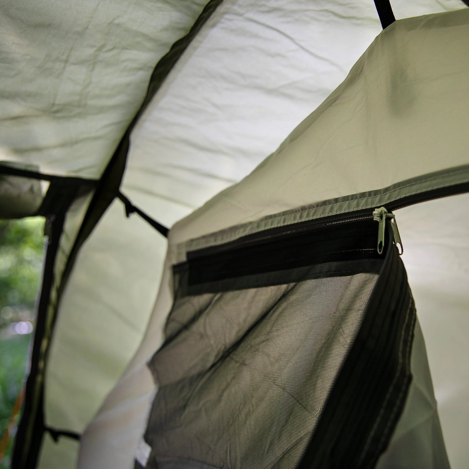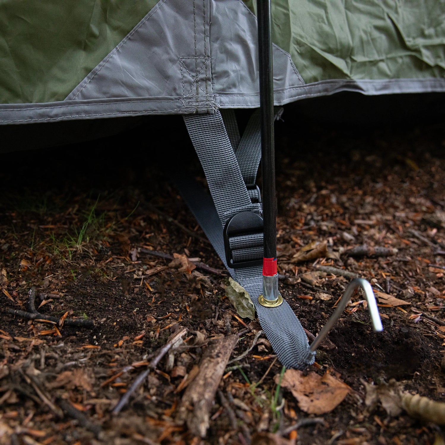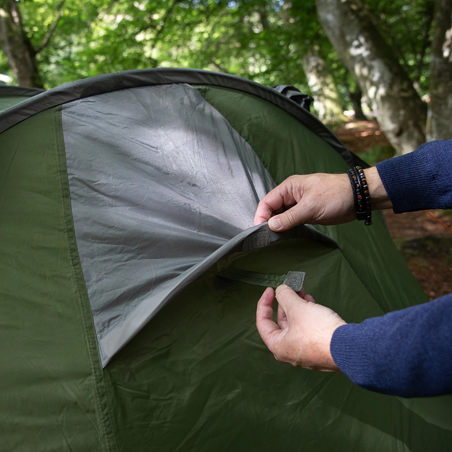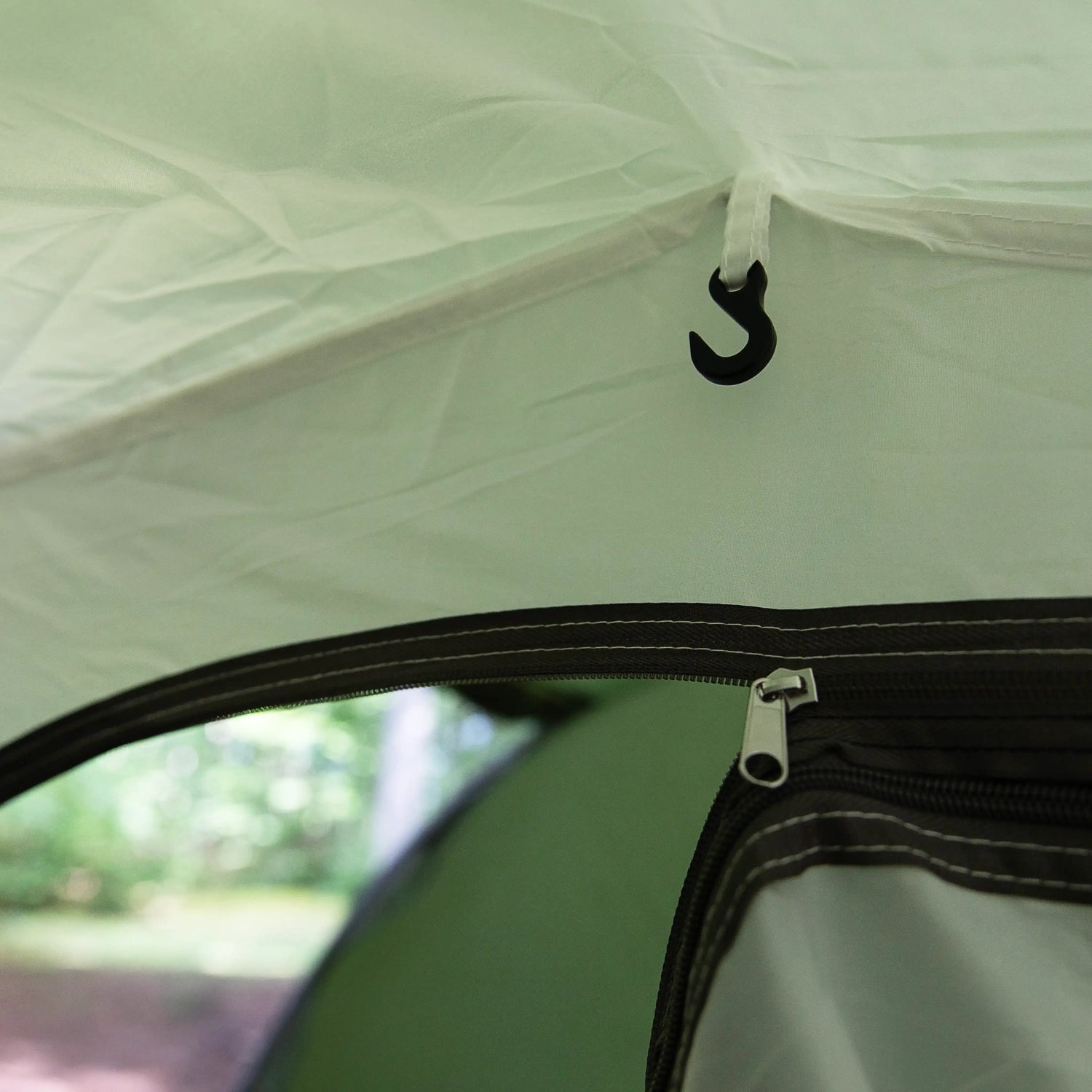 Tältet hålls upp av tre glasfiberbågar som enkelt träs in i de färgmärkta kanalerna. Innertältet krokas fast i yttertältet, låter du det sitta kvar i krokarna så reser du enkelt både inner- och yttertältet på samma gång! Spänningen i tältduken är lätt att justera med spännremmar som sitter vid tältets markfästen. Även golvet justeras med spännremmar.