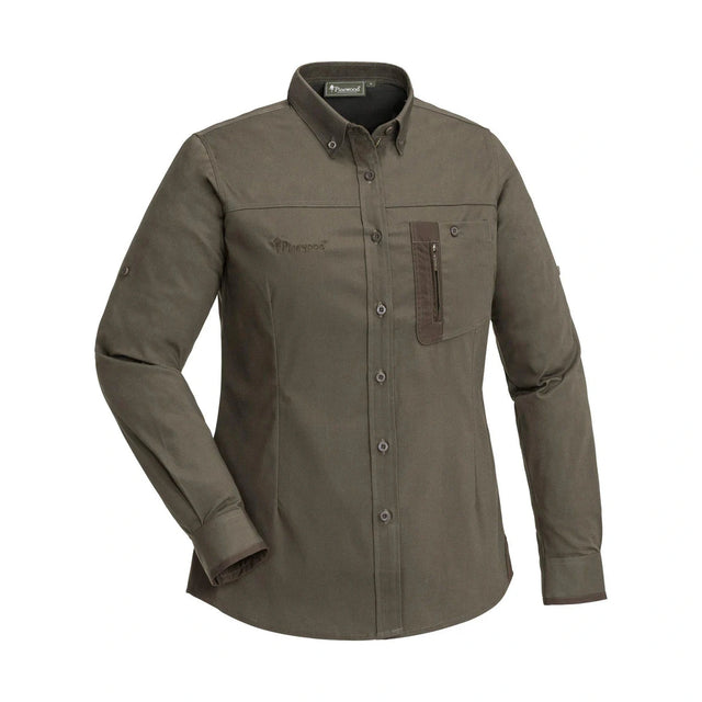 Stilren långärmad skjorta i TC-stretch som andas väl. Lättskött med easy-care material. Feminine cut. Modern fit. UV- och Mosquito proof. Passar utmärkt för outdoor, hiking, jakt. Utrustade med Pinewood NatureSafe teknologin som skapar en effektiv sköld runt de textila fibrerna, vilken gör att mygg och fästingar försöker att hålla sig borta från plagget.