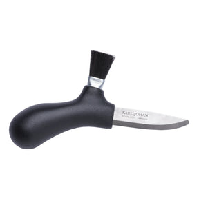 Det ergonomiska skaftet av polymer och det 1,4 mm tjocka, spetslösa bladet av återvunnet svenskt rostfritt stål är speciellt utvecklat för att enkelt kunna skära och rensa svamp. Borsten är tillverkad av äkta hästtagel och knivslidan av polymer är enkel att rengöra.