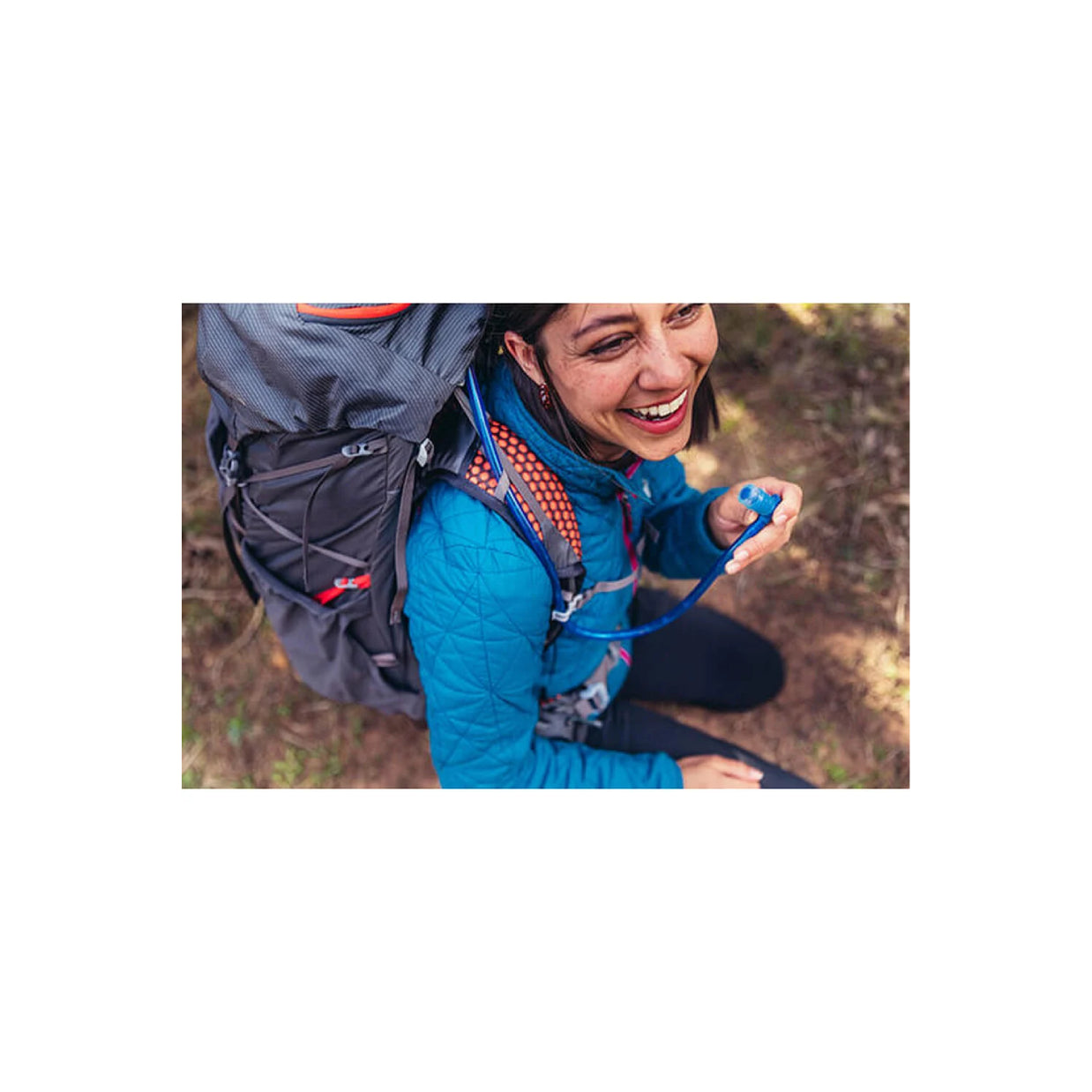 • Andningsbart axelband med bekväm vaddering och bröstrem som har integrerad nödvissla och fäste för vätskeslang