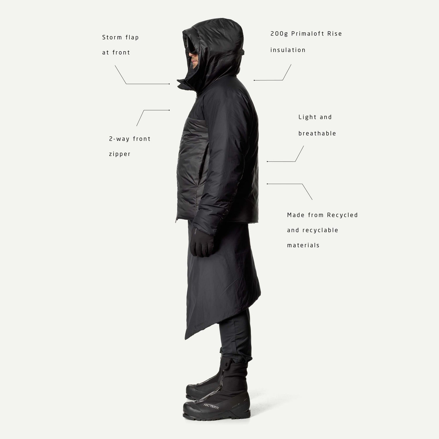• Isolering: PrimaLoft® Black Insulation RISE, 100 % återvunnen polyester (200 g/m²)