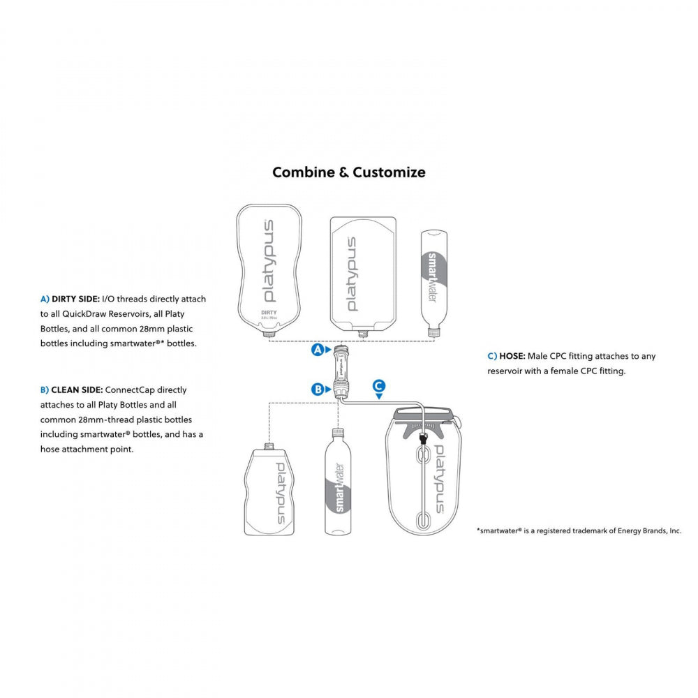Det är enkelt och smidigt att använda; fyll "dirty"-blåsan med vatten från närmaste vattendrag - skruva på din Quickdraw - tryck genom det smutsiga vattnet till en ren behållare alternativt genom slangen till en vattenblåsa. Det går både smidigt och snabbt med 3 liter/minut. Själva munstycket, på rena sidan, och adaptern (ConnectCap) passar till samtliga Platypus-flaskor, Smartwater-flaskor samt de flesta PET-flaskor (28 mm).