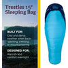 Trestles 15° sovsäcken är byggd för att prestera i kalla och fuktiga förhållanden när du är ute på vandring, hajk eller läger. SpiraFil™ högloftisolering håller dig varm även när det blir blött. Sovsäcken har tvåvägsdragkedja i full längd, 3D-huva för att skydda huvudet och rymlig 3D-fotbox för att hålla fötterna varma. Dess vågkonstruktion på toppen och filt-konstruktion på botten ger en oslagbar kombination av maximal värme och komfort där du behöver det. Om insidan blir för varm, använd den nedfällbara sekundära dragkedjan för att få lite luft. Använd förvaringsfickan för små föremål.